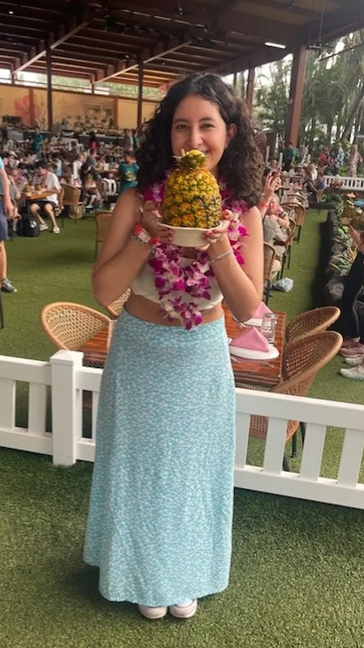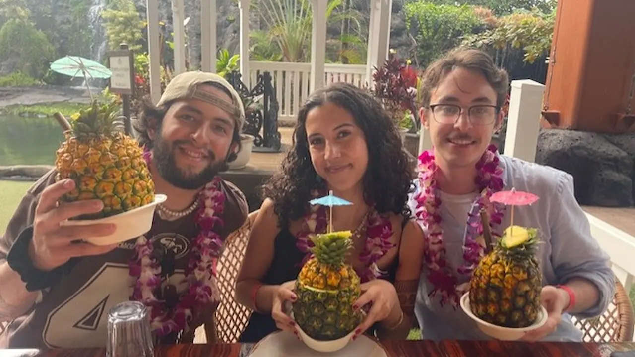 They also attended the Aliʻi Lūʻau in 2009 and thoroughly enjoyed it, which prompted them to attend again in 2025. “Miranda wanted to reprise her photo [we had taken] with the pineapple drink, and we remembered that the food was delicious.” The lūʻau presentation is a little different than the one they saw 16 years ago, but they did enjoyed the program and the dances. “We wanted to see them…this was our only lūʻau on this trip.”